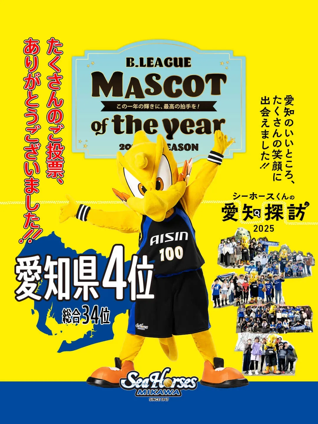 シーホース三河を応援いただいている皆様へ、感謝の言葉を送ります。B.LEAGUEの「MASCOT OF THE YEAR 2024-25」の結果が発表され、我らがシーホースくんが愛知県で見事4位、総合34位にランクインしました。これもひとえに皆様の温かいご支援のおかげです。心より感謝申し上げます。
