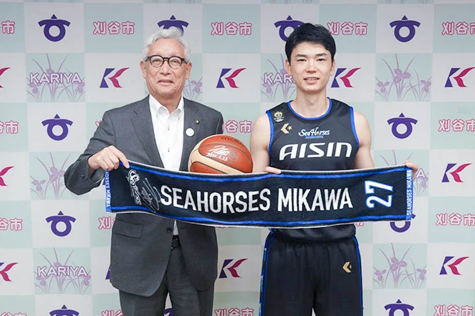 2024-25シーズンの始動を控え、シーホース三河の取締役社長、寺部康弘氏をはじめ、チームディレクターの佐古賢一氏、#27の石井講祐選手が刈谷市の稲垣武市長を訪問しました。この訪問は、地域とのつながりを深め、今後の活動について報告する貴重な機会でした。