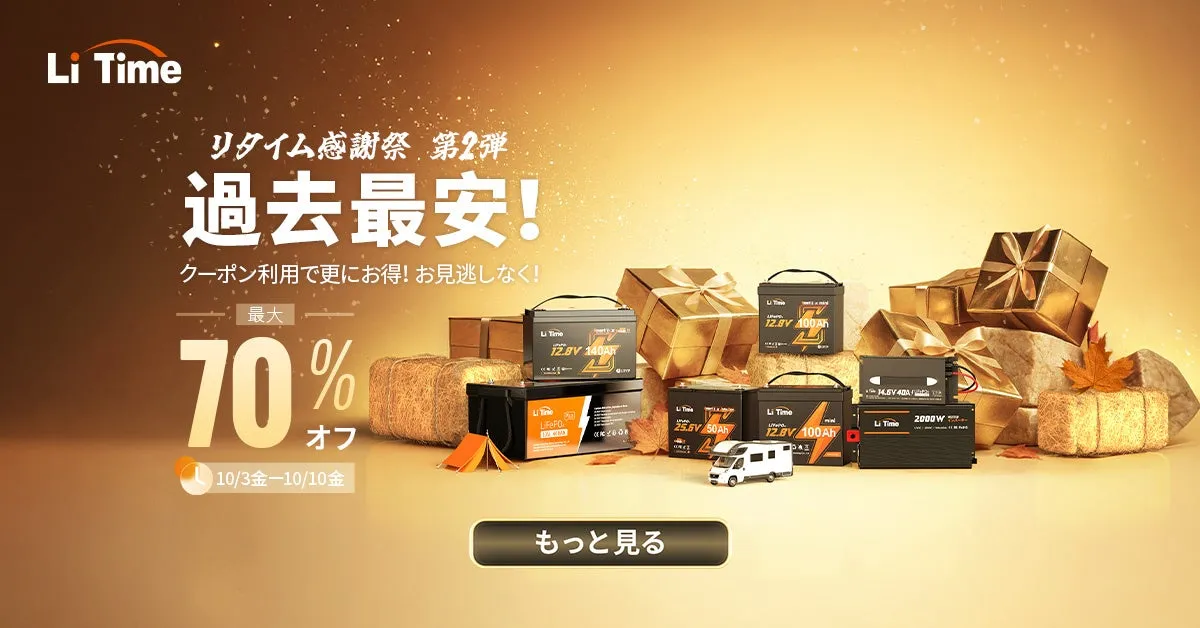 LiTimeの公式サイトからご覧いただけます。お得なバッテリーを見逃さないよう、最大70%OFFのこのチャンスをお見逃しなく!今すぐにでも確認して、パワフルなアウトドアライフを始めましょう!