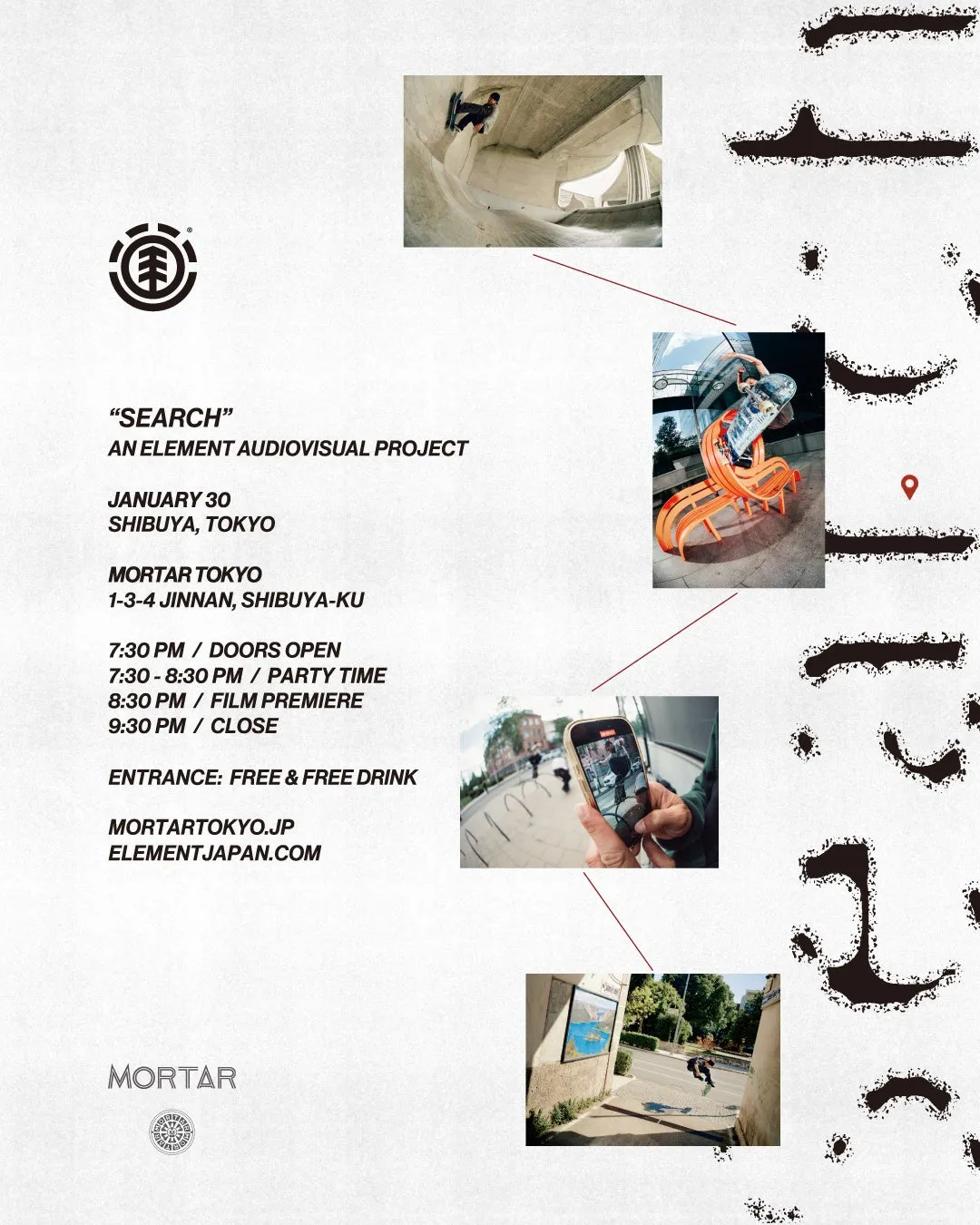 『Search』には、Element Skateboardsが誇る世界のトップライダーが集結。ブランドン・ウエストゲート、ヴィンセント・ミルー、ヤッコ・オヤネンといった著名な名前が映り込む中、日本のスケートボード界の星、瀬尻稜と青木勇貴斗もその顔ぶれに名を連ねています。彼らのダイナミックでクリエイティブなライディングは、見る者を魅了し、スケートボードの新しい可能性を感じさせることでしょう。
