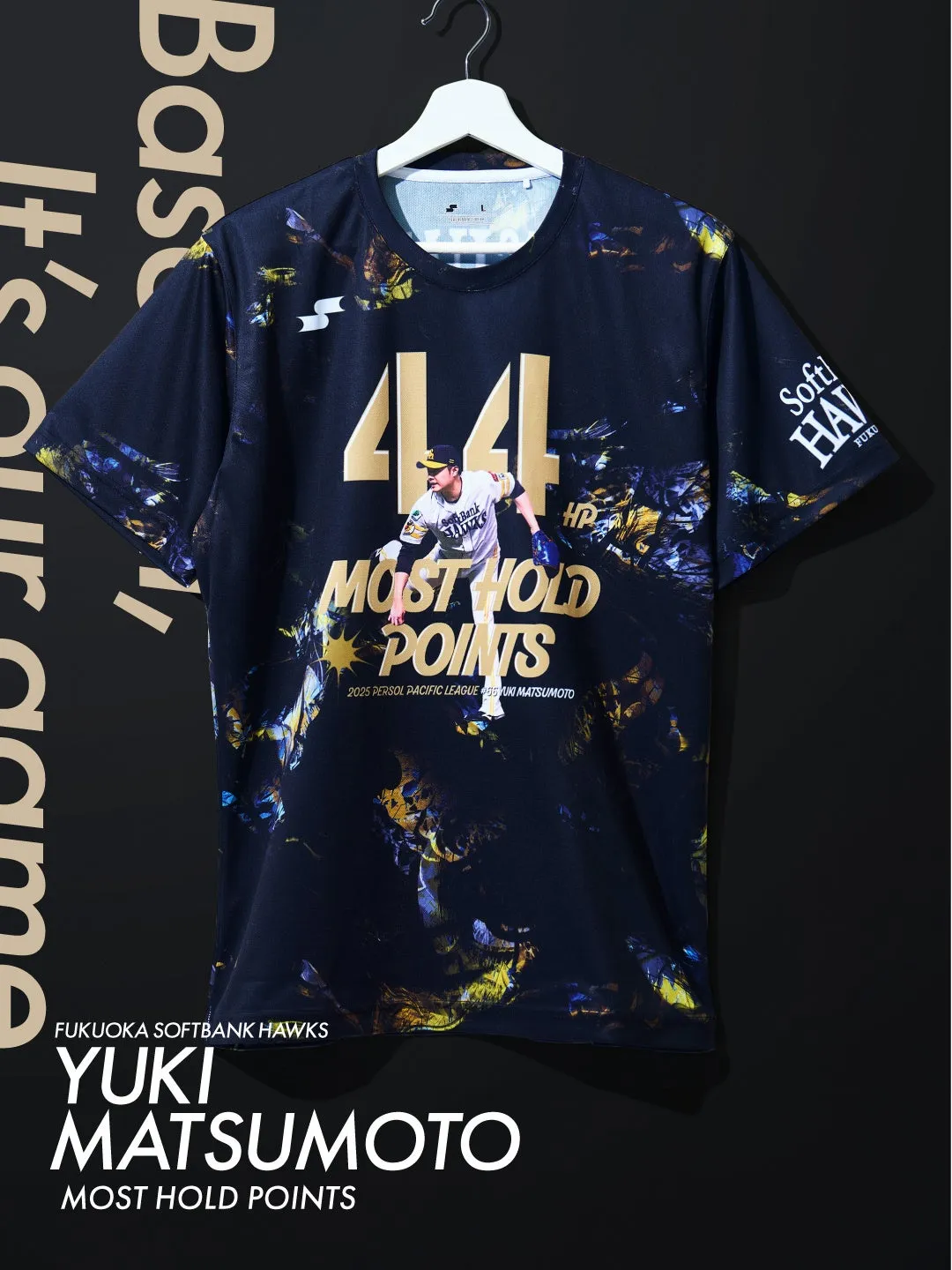 今回の記念Tシャツは、福岡ソフトバンクホークスを象徴する躍動感あふれる“鷹”が鮮やかにデザインされています。胸元には「44 HP」と金色で印刷され、松本選手の力強い投球動作が前面に配置されており、見た人の目を引くこと間違いなしです。中央には“MOST HOLD POINTS”というタイトルロゴがあり、さらにパリーグの名称や「#66 YUKI MATSUMOTO」という文字も見逃せません。左袖には球団のロゴもあしらい、松本選手が達成した栄光を共に祝福しています。
