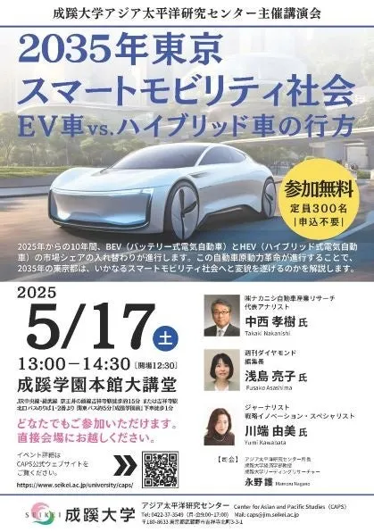 2025年5月17日、成蹊大学アジア太平洋研究センター主催の講演会が開催されます。タイトルは「2035年東京スマートモビリティ社会:EV車vs.ハイブリッド車の行方」。この講演会では、今後10年間で進行する自動車市場の大改革をテーマに、東京を中心としたスマートモビリティ社会の展望について詳しく解説されます。