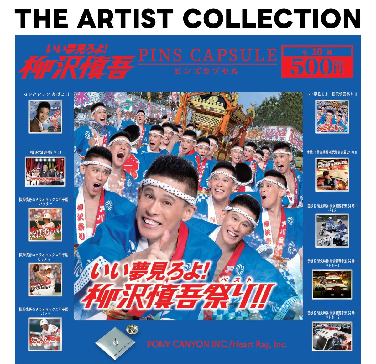 『THE ARTIST COLLECTION』では、柳沢慎吾がリリースしてきたCDや映像作品を基にしたピンバッジ(ピンズ)が登場します。タイトルは『いい夢見ろよ!柳沢慎吾祭り!!』。その名の通り、柳沢慎吾の魅力が詰まったアイテムです。カプセルの中には、専用台紙と共に収納された全10種類のピンバッジが含まれています。いずれも約25×25mmのサイズで、エポキシ樹脂や鉄を使用しており、コレクションにもぴったり。1回の購入価格は500円(税込)で、手軽に自分のお気に入りをゲットすることができます。
