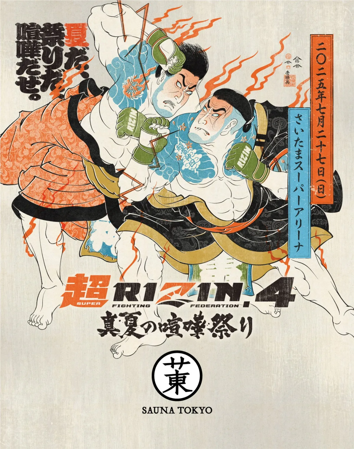 サウナ東京での施策に合わせて、2025年7月27日に「超RIZIN.4 真夏の喧嘩祭り」が予定されています。会場はさいたまスーパーアリーナで、11:00に開場し、13:00に開始する予定です。サウナ東京の特別な体験をぜひお見逃しなく。
