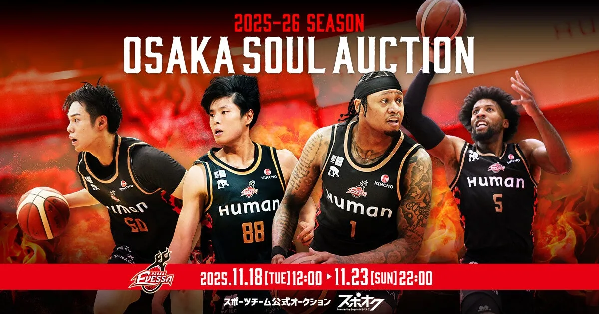 B.LEAGUEの人気チーム、大阪エヴェッサが2025年11月18日から11月23日までの期間、特別なオークション「2025-26シーズン OSAKA SOUL AUCTION」をスポーツチーム公式オークションサービス「スポオク」で実施します。このオークションは、ホームゲームの勝利時にのみ開催され、選手たちが壇上にて特別なアイテムを入手できる貴重な機会です。