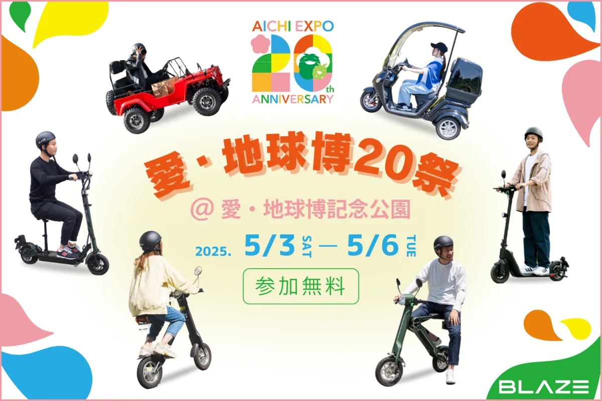 「愛・地球博20祭」は、2005年に開催された愛知万博から20年が経過することを記念して実施される特別なイベントです。愛知万博の精神を引き継ぎ、環境や持続可能な社会について再考する機会を提供するために、愛・地球博記念公園で様々なプログラムが用意されています。ブレイズはこのイベントを通じて、最新の電動モビリティの魅力を存分に試乗体験してもらいたいと考えています。