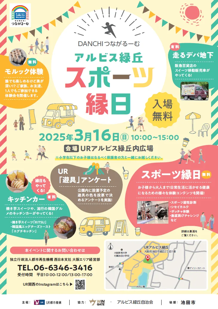 2025年3月16日、大阪府池田市にあるURアルビス緑丘団地内の広場で、地域住民を対象にした「スポーツ縁日」が開催されます。このイベントは、運動習慣の定着と健康寿命の延伸を目指しており、子どもから高齢者までが参加できる多彩なプログラムが用意されています。主催は独立行政法人都市再生機構(UR都市機構)で、協力には株式会社ウィンゲートとアルビス緑丘自治会が名を連ね、後援には池田市が付きます。
