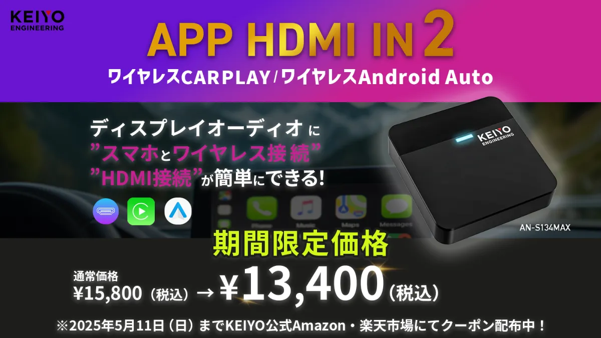 2025年4月25日に発売される『AN-S134 MAX』が注目を集めています。この製品は、KEIYOが手掛けた新しいワイヤレスデバイスで、Apple CarPlayやAndroid Auto、HDMI入力機能を一つに統合した三つの機能を一つにまとめた、まさに新感覚のアイテムです。また、期間限定で発売記念価格の13,400円(税込)で購入できるキャンペーンも開催中ですので、エンターテインメントデバイスをお探しの方には絶好のチャンスです。