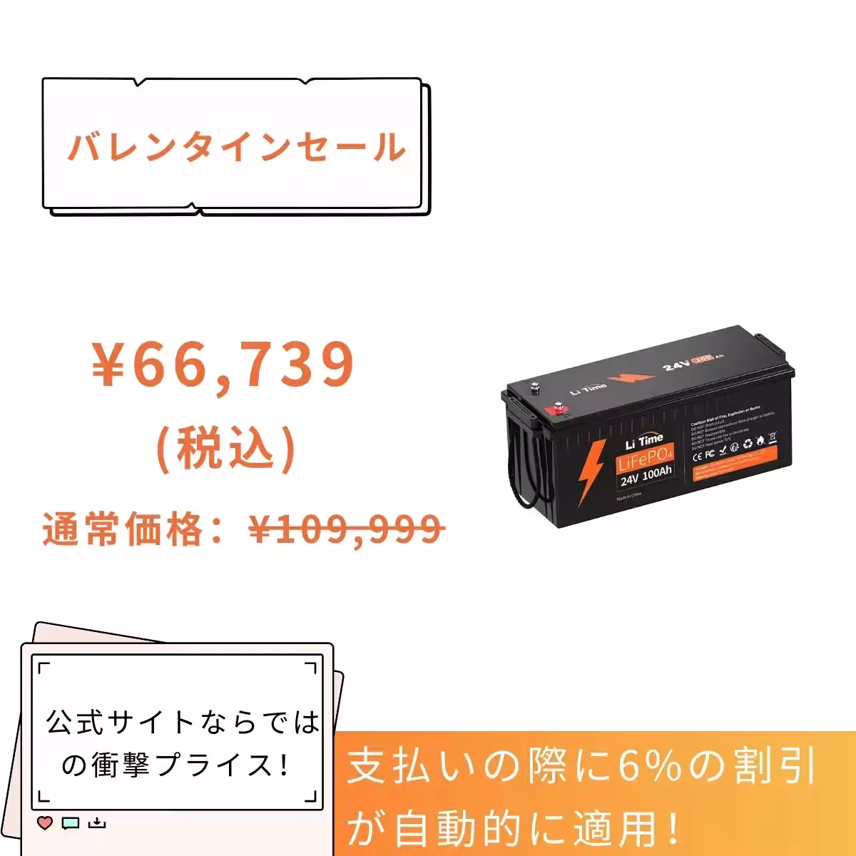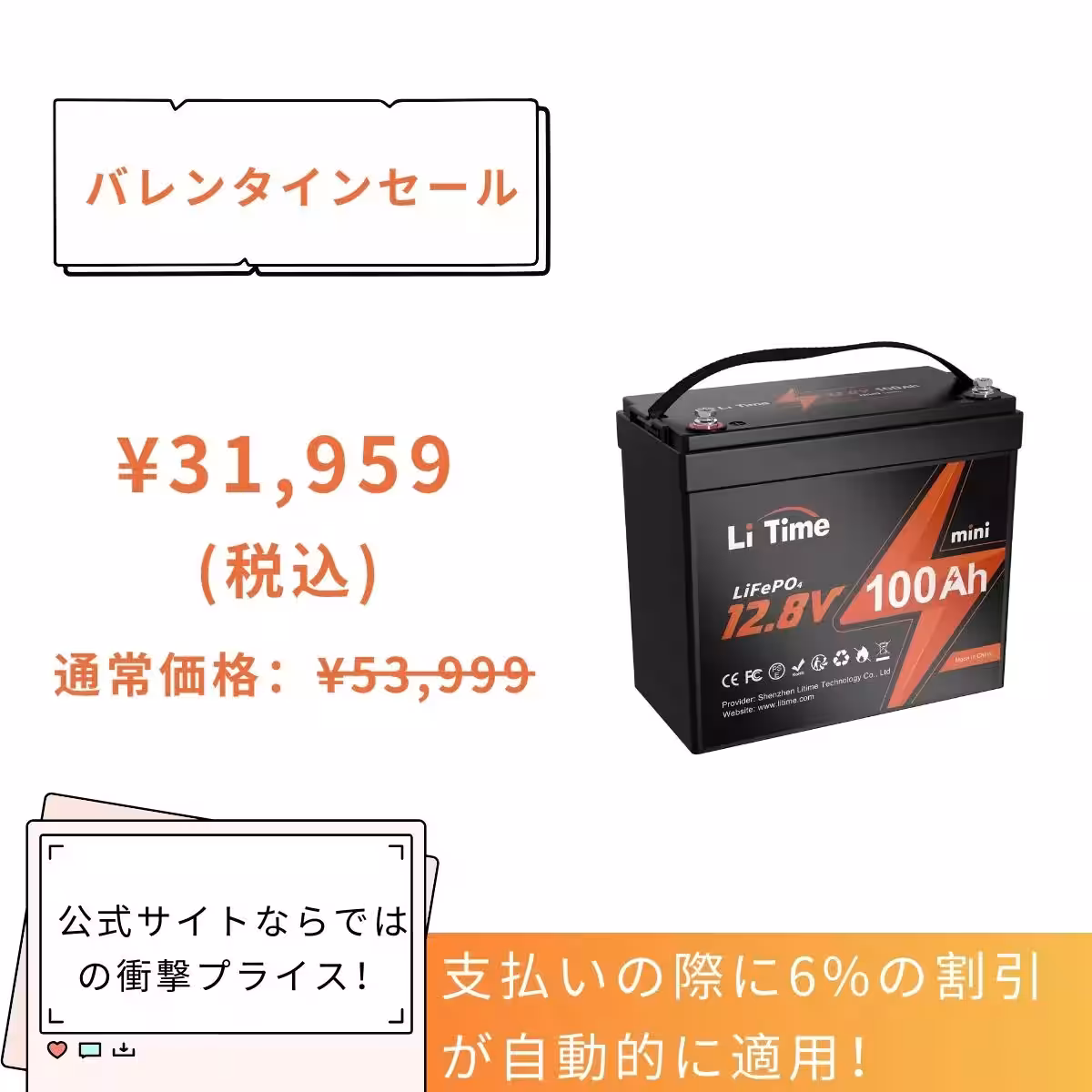LiTime(リタイム)は、バレンタインデーに合わせて豪華なセールを実施中です。全商品が対象となるこのセールは、最大55%の割引が受けられる嬉しい機会です。さらに、特別なクーポンが併用可能で、実質的な割引率も上がります。特に大容量のリン酸鉄リチウムイオンバッテリーセットは、おすすめの一品です。