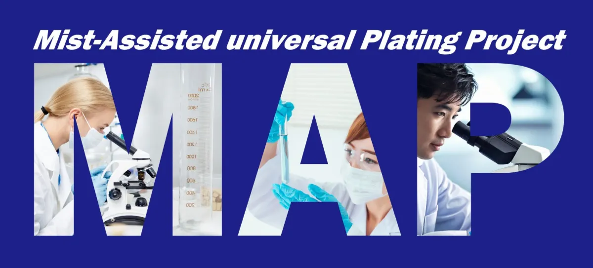 MAPとは、Minist-Assisted universal Platingの略で、独自に開発したミストめっき法により、従来の技術では難しかった絶縁体上への金属膜の成膜を目指すプロジェクトです。この技術は、大量の廃液処理を解決するだけでなく、めっきに使用する水の量を削減することができます。環境に配慮した新たなめっき技術の確立を目指し、持続可能な未来に貢献するプロジェクトです。