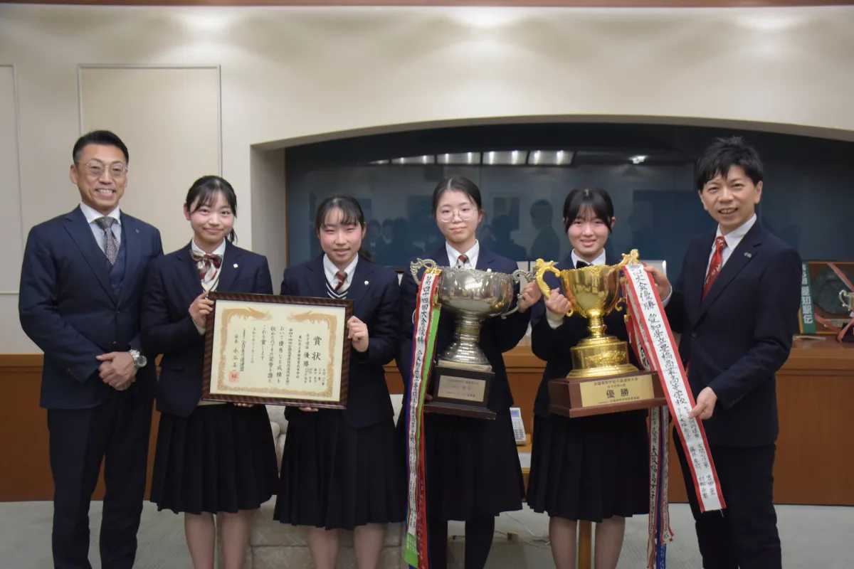 大会の後、生徒たちは長坂市長を表敬訪問し、喜びと感謝の意を伝えた。今回の大会に参加したのは、団体競技に出場した1年生の本間心乃華さん、2年生の吉田藍さん、藤井李羽さん、村松歩果さんの4人。この中で藤井さんは個人競技にも出場し、見事5位入賞を果たした。