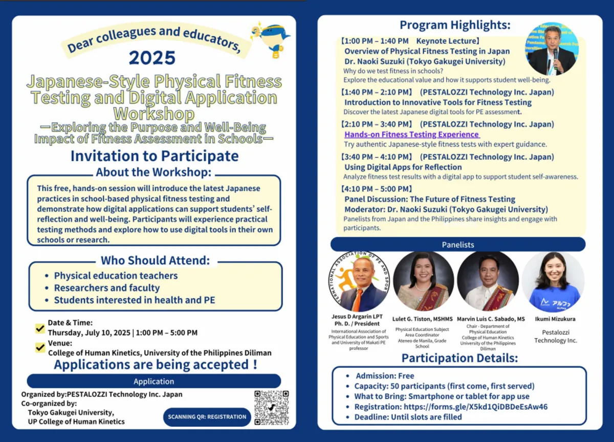 2025年7月10日、フィリピン大学ディマリン校で『ALPHA』に関連したフィットネスワークショップを開催します。このイベントは、Pestalozzi Technology株式会社が、日本の体力テスト制度とそのデジタル化の利点を海外に普及させる一環として企画されました。