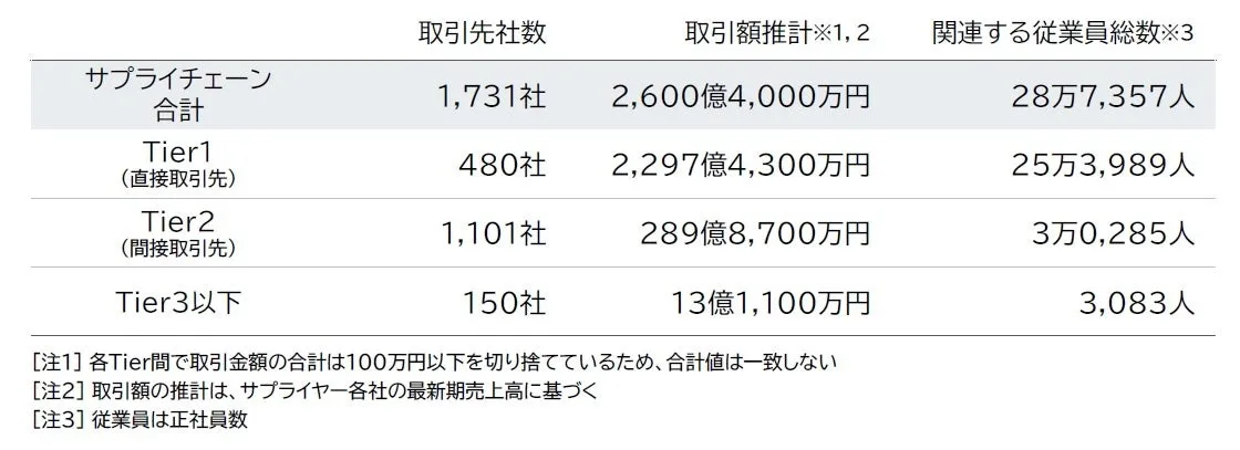 特に注目すべきは、サプライヤー企業の内訳です。取引階層別に見ると、最も直接的な取引を行う「Tier1」は480社で、取引額は約2297億円、従業員数は25万3989人に上ります。一方、より下の階層である「Tier2」には最も多い1101社が存在し、「Tier3」以下は150社と、明確な階層構造が見受けられます。これらの企業は、「製造業」が最も多く、全体の近6割を占めています。