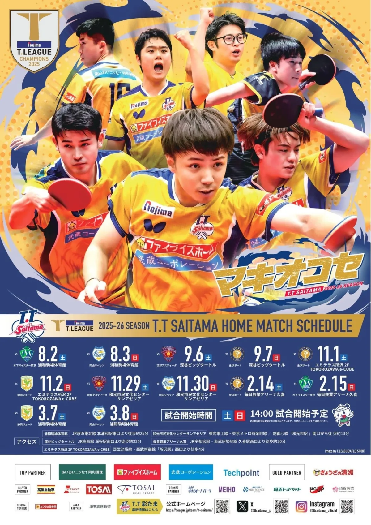 いつもT.T彩たまの応援ありがとうございます。2025-2026シーズンのポスターが完成し、そのデザインには“マキオコセ”というスローガンが込められています。このポスターは、埼玉県内を中心に、さまざまなパートナー企業や団体の協力を得て掲出される予定です。