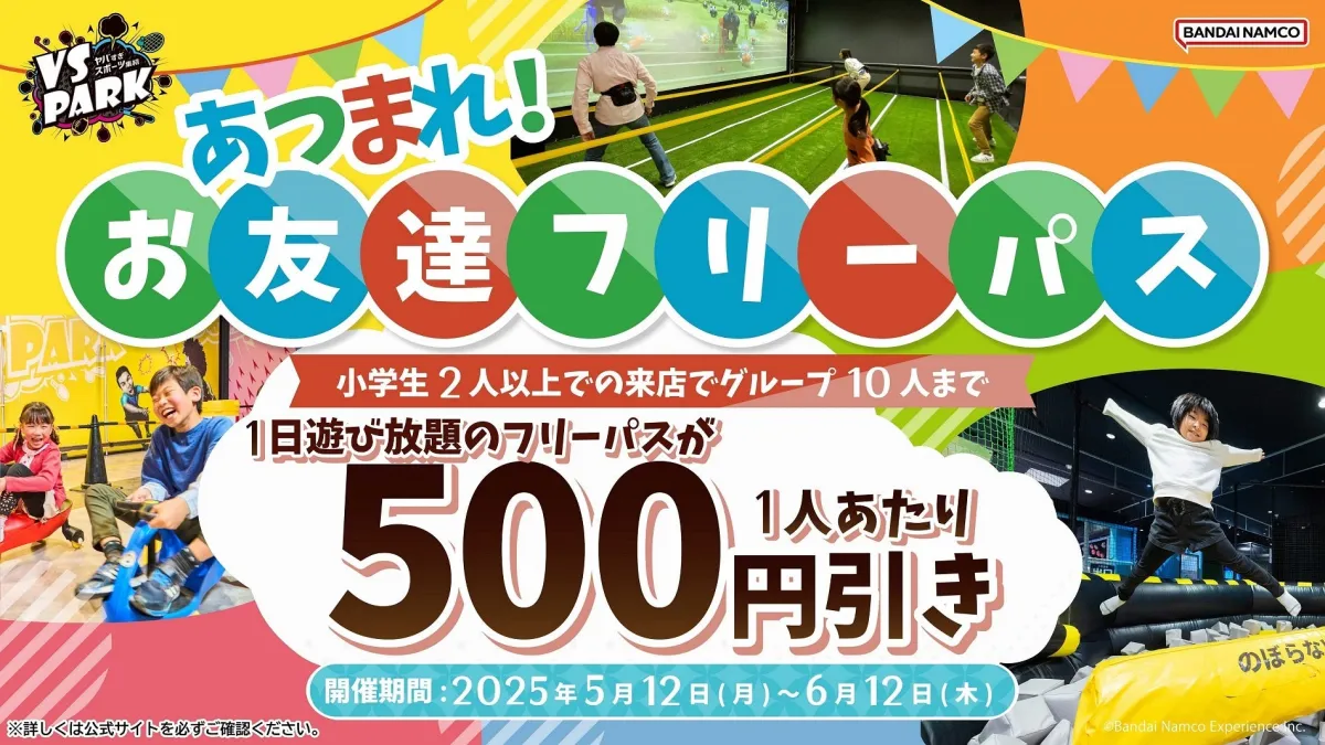 株式会社バンダイナムコアミューズメントが運営している屋内アクティビティ施設『VS PARK』が、小学生を対象にした特別キャンペーン「お友達フリーパス」を発表しました。このお得なフリーパスは、2025年5月12日から6月12日までの期間中に、小学生2人以上で訪れるグループが利用可能で、クーポンを提示することでフリーパスが1人あたり500円割引になります。