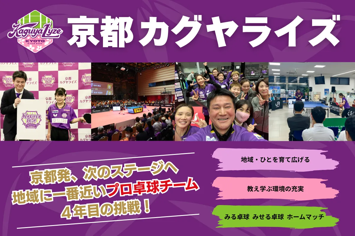 このプロジェクトは、卓球を通じて地域に愛されるチームであることを目指すものです。京都カグヤライズは、地域の皆さまに卓球の魅力をもっと身近に感じてもらい、共に成長するための第一歩を踏み出しました。地域と共に、心温まる卓球文化を未来へ繋げていきます。