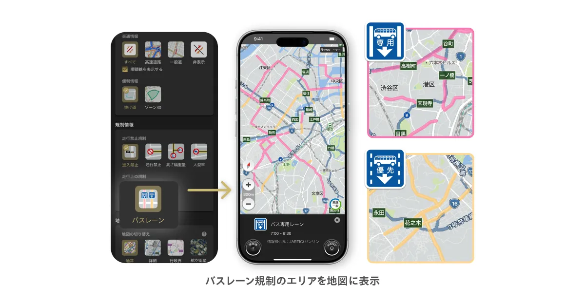 過去の調査では、半数以上のドライバーが補助標識を見落とす経験があることが明らかになっています。特に、規制時間帯においては注意が必要です。この新機能は、ドライバーからの「バス専用・優先レーンについての詳しい情報が欲しい」という声を受けて開発されました。地図上でバス専用レーン(ピンク)とバス優先レーン(黄色)を視覚的に表示することで、運転中の注意喚起が可能になります。