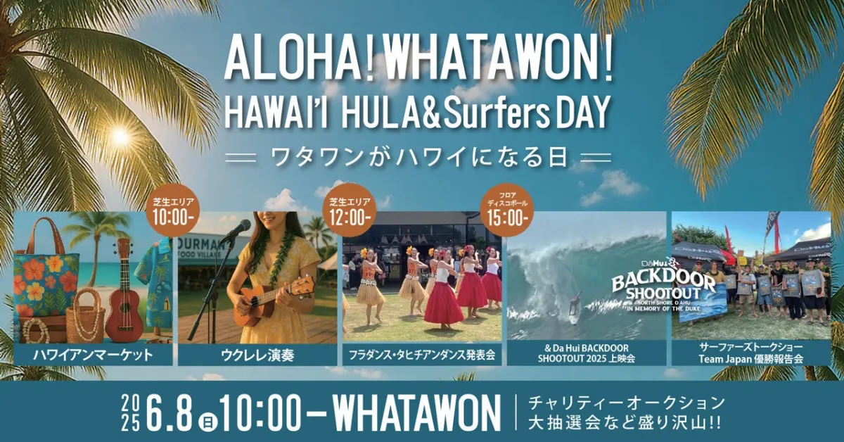 大阪の岸和田に位置する滞在型エンターテインメントモール「WHATAWON」が、2025年6月8日(日)に南国ハワイをテーマにした特別イベント「ALOHA!WHATAWON! HULA&Surfers DAY」を開催します。このイベントは、青い空と爽やかな風を感じながら楽しむことができる、まさに夏を先取りする絶好の機会です。