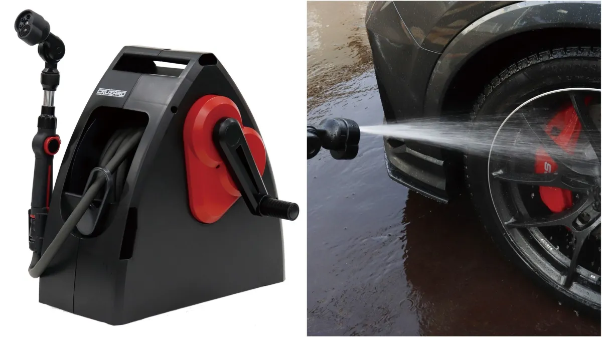 「CRUZARD洗車ホースリールギアスピードプラス」は、優れた巻き取り機能と多彩な水形機能を兼ね備えたホースリールです。従来のモデルに比べ約2倍のスピードでホースを巻き取ることができる楕円ギアを採用。手元で操作可能な水形と水量の調節も行えるため、洗車工程に合わせた効率的な洗浄が可能です。