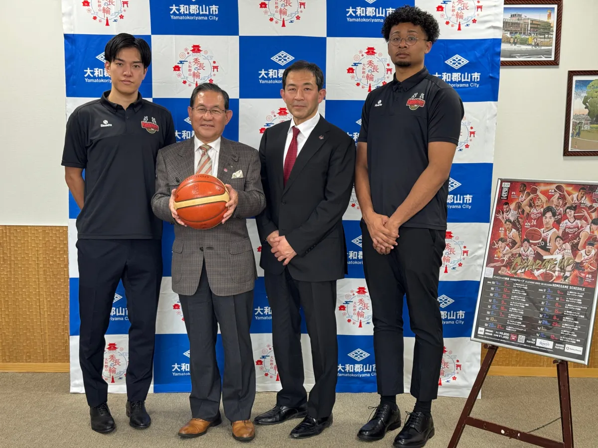 バンビシャス奈良の選手たちが大和郡山市の上田清市長を訪問しました。この訪問は、2025-26シーズンのレギュラーシーズンが始まる中、チームの今季に向けた意気込みを伝える重要な機会となりました。訪問者は、加藤真治代表取締役、#7古牧昌也選手、そして#10イデムディア・オサセレ選手の3名です。