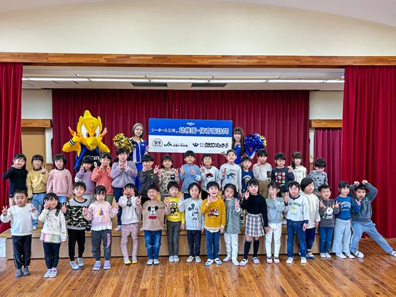 シーホース三河が行う特別な訪問イベントが、2025年2月4日に安城市のゆたか保育園で開催されました。この日は、シーホースくんとSuper GirlsのメンバーであるSAYAKAさんとRIKOさんが参加し、園児たちと共に楽しい時間を過ごしました。