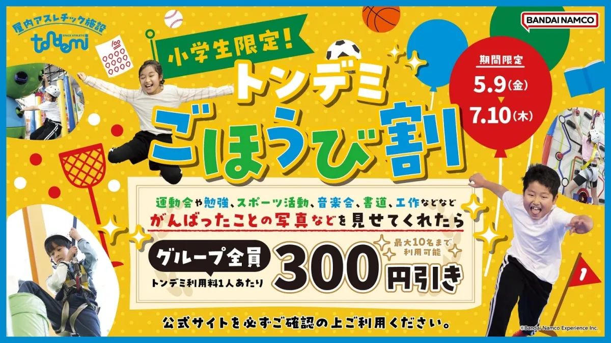 株式会社バンダイナムコアミューズメントが展開する屋内アスレチック施設『トンデミ』で、小学生を対象に特別なキャンペーンが始まります。今年も運動会やテストの頑張りを思い出として楽しむための「ごほうび割」が、2025年5月9日(金)から7月10日(木)まで実施されます。この割引キャンペーンでは、頑張ったことの証となる写真や作文を提示することで、グループ全員がトンデミの利用料金をお得に利用できます。