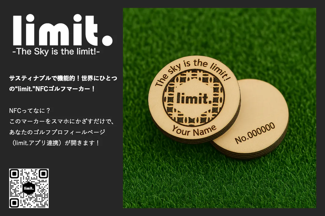 「limit.」は、ゴルフ仲間を見つけたり、各種ゴルフイベントに参加するためのプラットフォームです。「The sky is the limit!」というコンセプトのもと、利用者がより豊かなゴルフライフを送れるようにサポートします。この度、さらなるサービス向上を目指し、オリジナルのNFCゴルフマーカーを展開することとなりました。