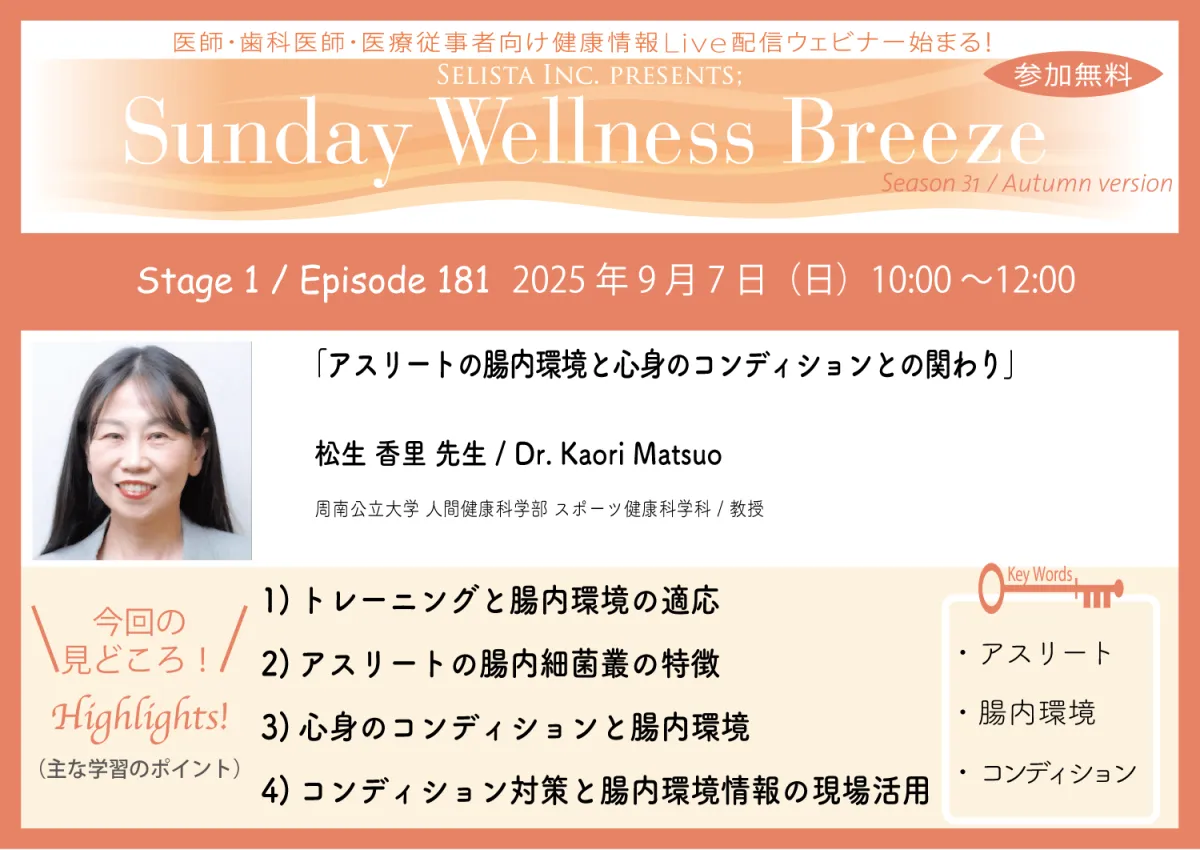 2025年9月7日、医療従事者向けの無料オンラインセミナーが開催されます。このセミナーでは、松生香里先生(周南公立大学教授)が「アスリートの腸内環境と心身のコンディションとの関わり」について詳細に解説します。特に、アスリートがパフォーマンスを最大限に発揮するためには、腸内環境がどれほど重要かを理解する良い機会です。
