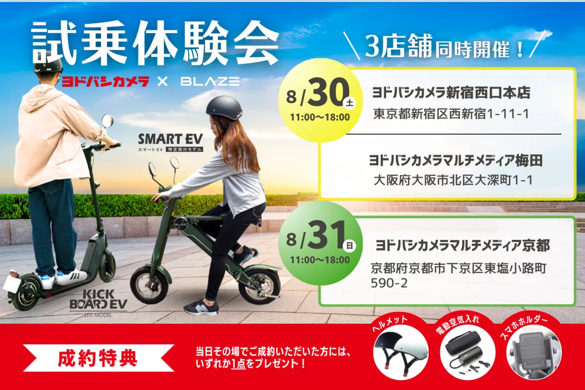 2025年8月30日(土)と31日(日)の2日間、ヨドバシカメラの関東・関西にある3店舗にて、株式会社ブレイズの特定原付モデル「スマートEV」と「キックボードEV」の試乗体験会が初めて同時開催されることが決まりました。新しい電動モビリティに興味がある方は、この機会を是非お見逃しなく!