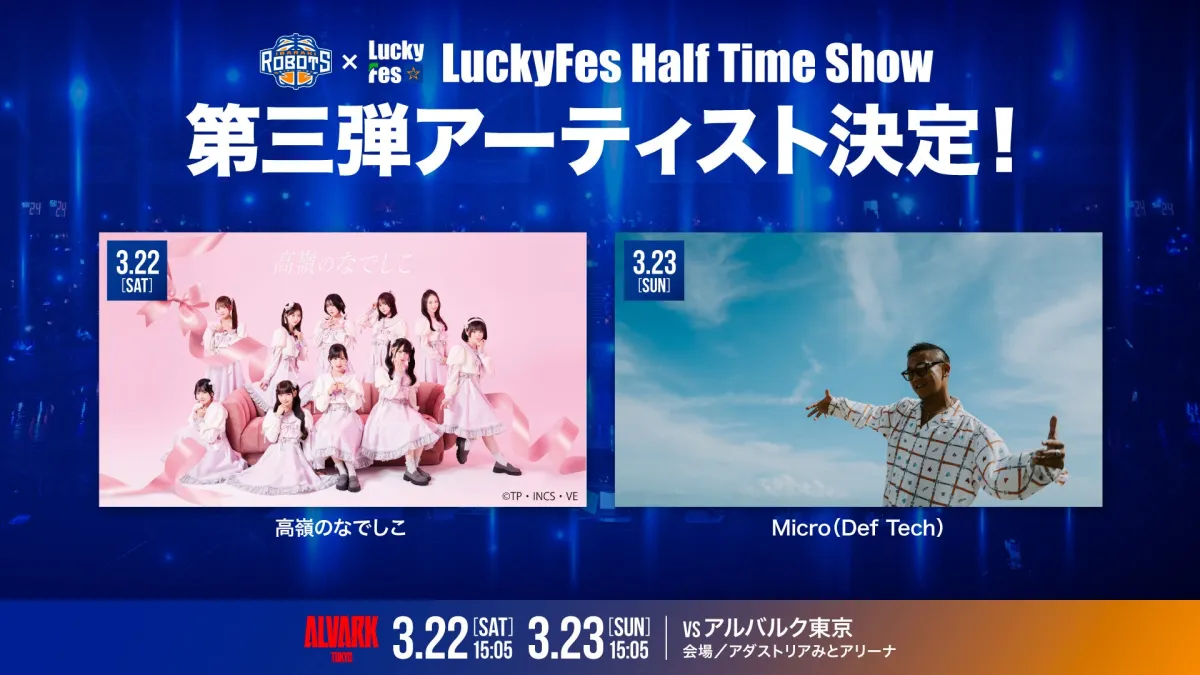 茨城ロボッツのハーフタイムショーが今年も楽しみな内容で盛り上がりを見せています。特に注目したいのが、3月22日(土)に登場する「高嶺のなでしこ」と、3月23日(日)にパフォーマンスを行う「Micro(Def Tech)」です。このイベントは、昨年7月に行われた国営ひたち海浜公園での音楽フェス「LuckyFes」とのコラボレーションによるもので、毎回多くの観客を魅了しています。