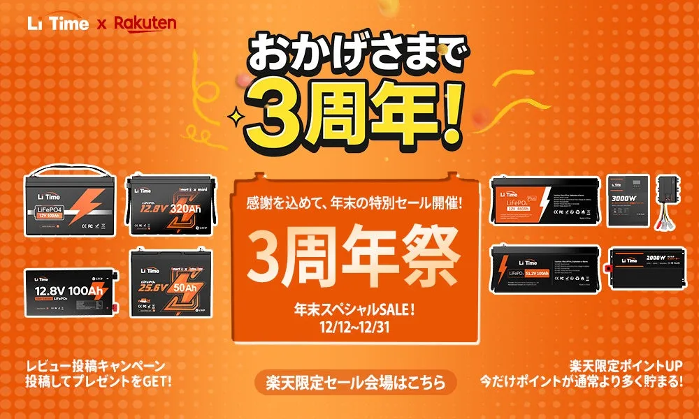 LiTime楽天市場店がこのたび開店3周年を迎えました。この3年間は、高品質で信頼性の高い製品を提供することに力を入れ、多くのお客様に日常生活や非常時において役立つエネルギーソリューションをお届けしてきました。特に、安心して使える製品を重視しており、多くの方々にご支持いただくことができました。