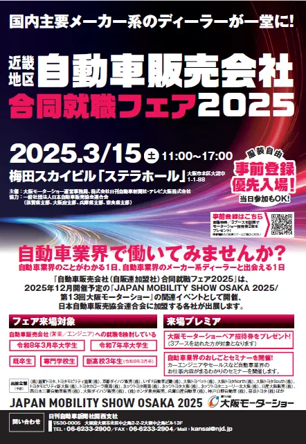 自動車好きの皆さんに朗報です!2025年3月15日(土)、大阪の梅田ステラホールで「近畿地区 自動車販売会社合同就職フェア」が開催されます。このフェアでは、滋賀トヨタや大阪トヨペットをはじめとする国内主要メーカー系ディーラーが集結し、自動車業界でのキャリアを考える方々に多くの情報が提供されます。入場は無料なので、自動車業界に興味がある方はぜひ参加してみてください。