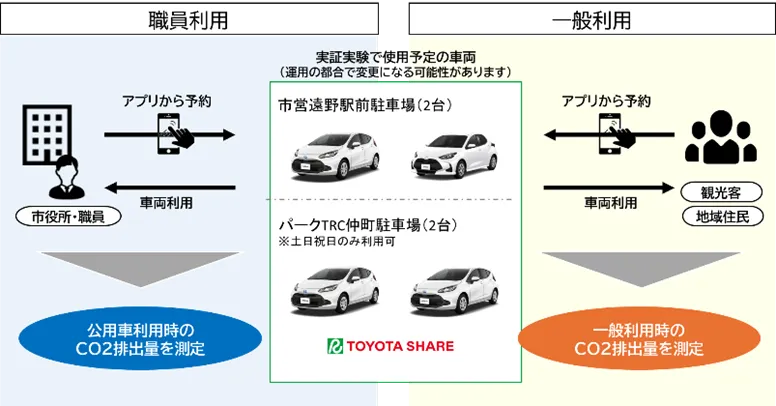 実証実験では、カーシェアの利用状況や利用者の満足度を調査し、実際のサービスの役立ち具合を検討します。また、利用シーンごとにガソリン車とハイブリッド車のCO2排出量を分析し、環境車導入の有用性を判断します。これにより、遠野市は将来的な環境車配備計画にもこのデータを活用できるかを見極めることが可能です。