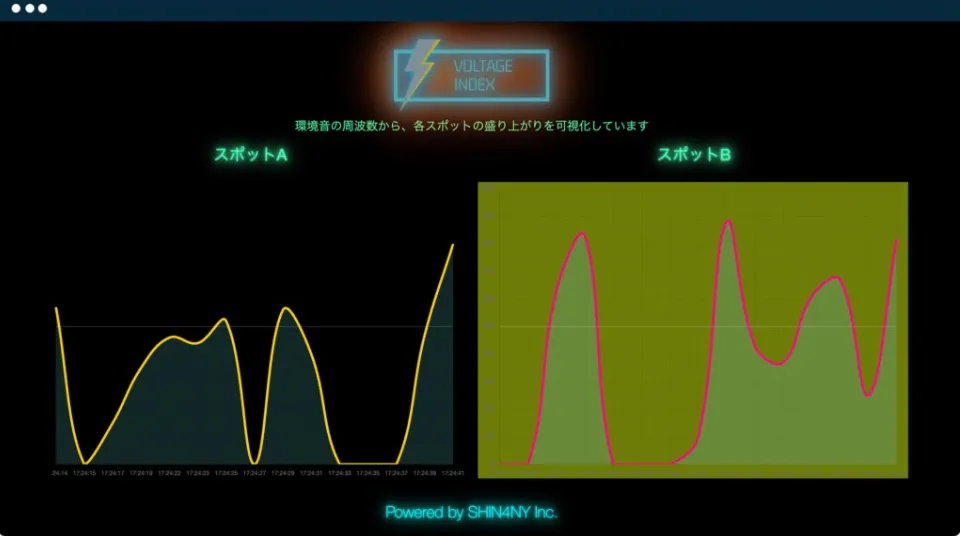 SHIN4NYが開発した「ボルテージ指数®︎」は、スタジアム内の観客から得られる声援のデータを解析し、熱狂度を0〜100ポイントのスケールで可視化するリアルタイム音声解析技術です。このシステムは、観客の応援がどれだけチームに影響を与えているかを測定するもので、観戦者と選手の一体感を生み出します。