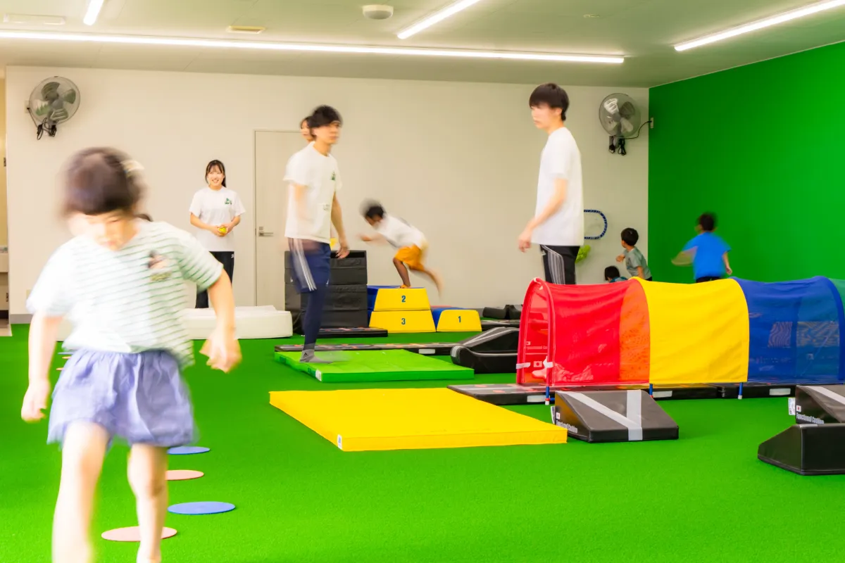 - - 内容: 芝生でのアスレチック体験や、マット・鉄棒・跳び箱などの挑戦コーナーがあります。スタッフによる運動サポートも行います。