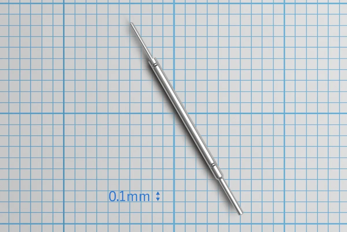 このプローブは、大量生産されるトランジスタや回路が搭載されたシリコンウェハの電気検査に使用されます。特徴的なのは、その構造です。プローブは、上下のピン(プランジャー)とチューブ(バレル)、さらにはスプリングの4つの部品から成り立っています。スプリングは、ピンを押すことで反応し、安定した検査を実現します。