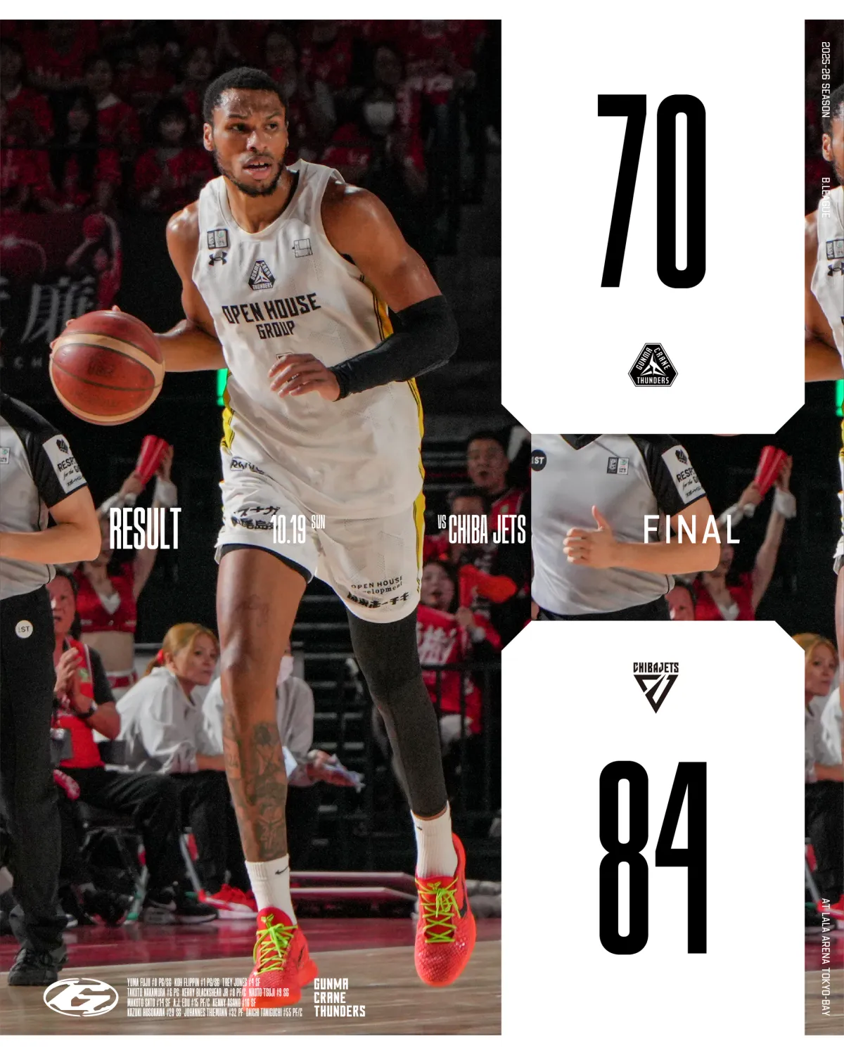 2025-26シーズンのB.LEAGUEで、群馬クレインサンダーズは10月19日(日)に千葉ジェッツと対戦しました。試合は厳しい展開となり、最終的にバッグのスコアで千葉ジェッツが勝利。