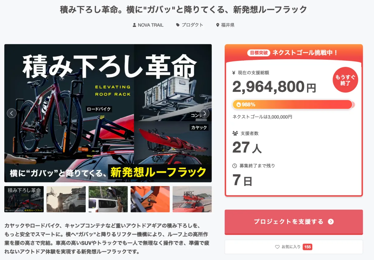 この新しいルーフラックのクラウドファンディングプロジェクトは、2026年2月に始まり、たった1時間で目標金額の30万円を達成、さらに10時間後には支援総額が100万円を超えました。2026年3月24日現在、支援総額は約296万円に達し、達成率はなんと988%!支援者の熱い反響がうかがえます。残りの期間も、ご購入を検討している方々からのサポートを期待しています。