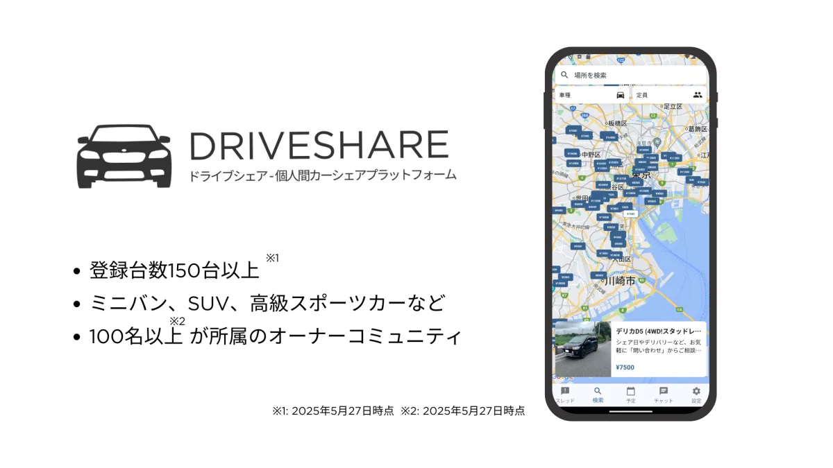 DriveShareは、2024年末に終了した個人間カーシェアサービスを元にしたアプリで、150台以上の登録車両を提供し、累計の共同使用料は400万円を超えています。利用者数も1,500名を突破しており、豊富な車種のバリエーションからユーザーのニーズに応じたカーライフが実現可能です。