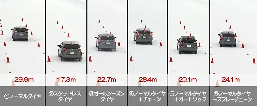 さらに、この時期の運転では雪道対策も重要です。JAFは、圧雪路や氷盤路でのタイヤによる制動距離について実験を行っており、その結果は驚くべきものでした。圧雪路での実験では、スタッドレスタイヤが最も短い距離で停止でき、ノーマルタイヤに比べて約1.7倍も制動距離が長くなることがわかりました。氷盤路では、ノーマルタイヤの制動距離がチェーンを装着した場合の約1.8倍に達しました。これらのデータは、雪道をノーマルタイヤで走行することがいかに危険かを示しています。