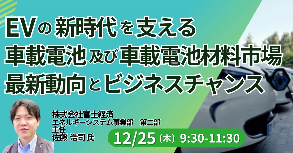 年末の12月25日(木)、日本計画研究所(JPI)は、EV産業に焦点を合わせた重要なセミナーを開催します。講師として株式会社富士経済エネルギーシステムの主任、佐藤浩司氏をお招きし、車載電池及びその材料市場の最新動向とビジネスチャンスを解説していただきます。