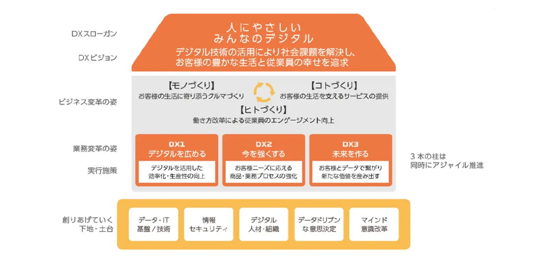 ダイハツは2025年度末の目標であった1,000名のDX人材育成を、実際には2023年10月時点で早期達成しました。これは国の認証制度である「DX認定制度」にも評価されており、ダイハツの取り組みの信頼性を高めています。加えて、今般発表されたDXビジョンに基づくロードマップを策定し、業務のみならず組織や風土改革に向けた具体的な方針を明示しました。