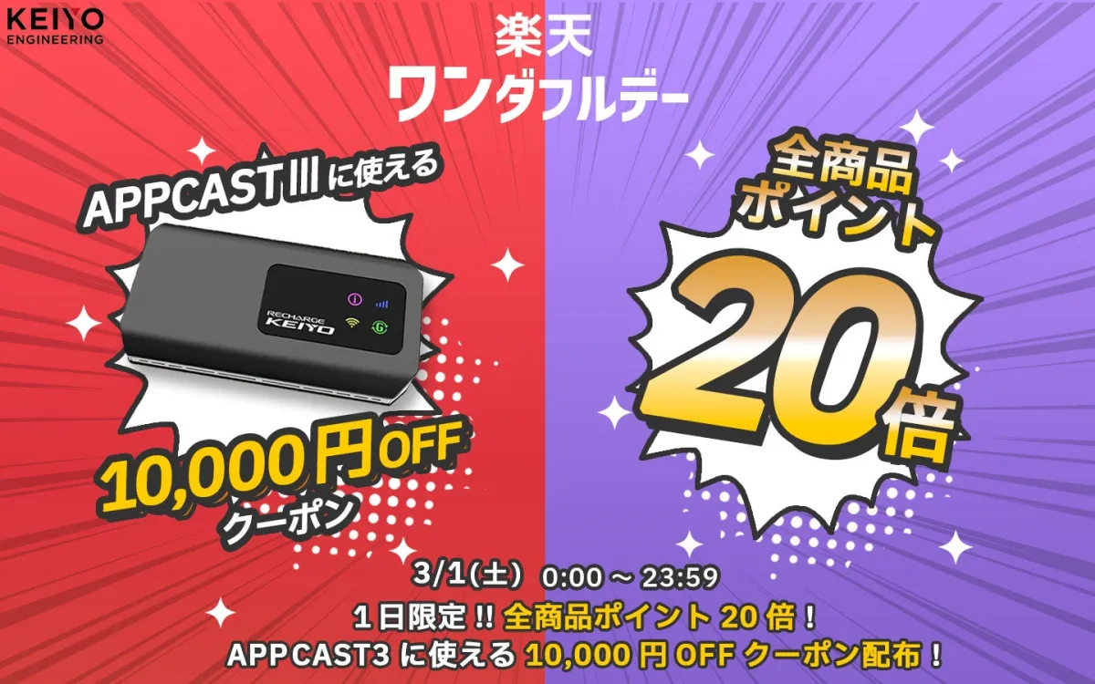 2025年3月1日、楽天で開催されるワンダフルデーに、KEIYOの最新製品APP CAST3が過去最大の特価で登場します。この日は特別企画として、APP CAST3が10,000円オフのクーポン適用で、実質31,840円で購入可能に。さらに、KEIYO公式ショップの全商品も楽天ポイント20倍という嬉しい特典がついてきます。