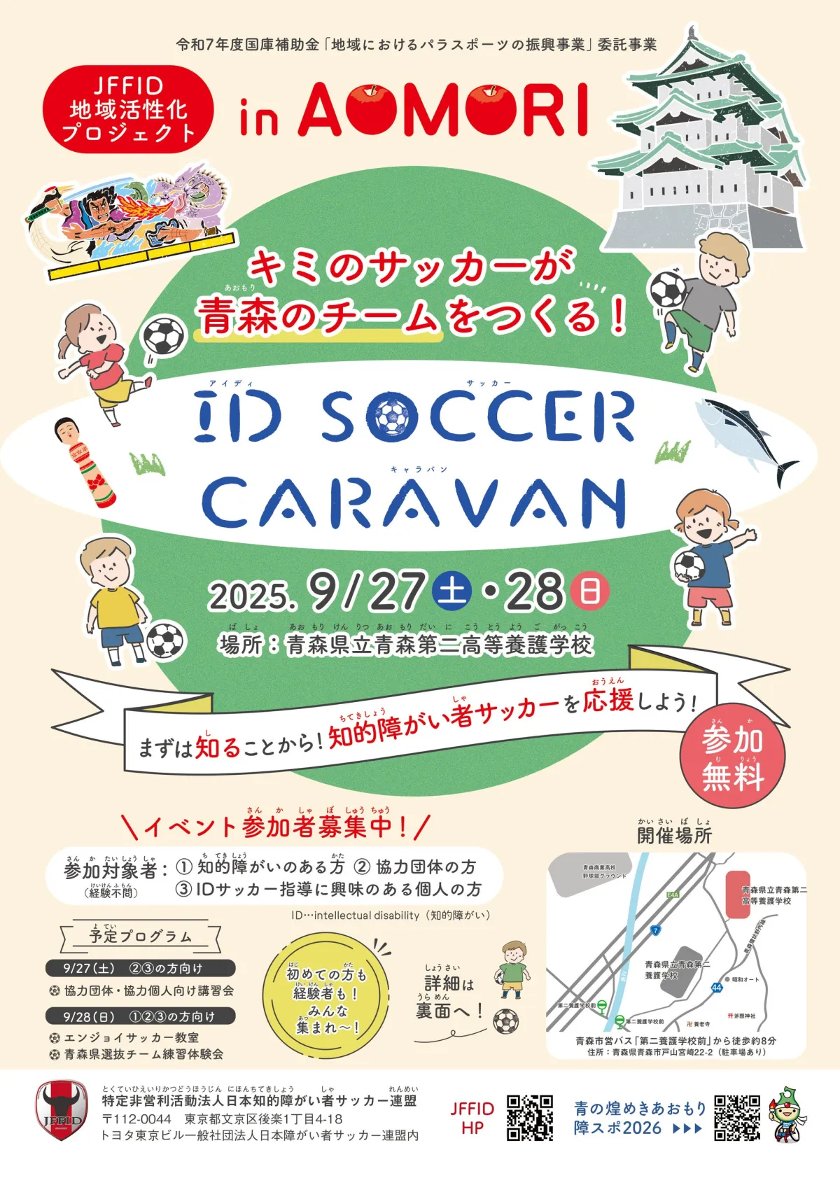 2023年9月27日から28日、青森県青森市にて特定非営利活動法人日本知的障がい者サッカー連盟(JFFID)が主催する「ID SOCCER CARAVAN」が開催されます。このイベントは、知的障がい者サッカーの認知を広めるだけでなく、地域の交流を促進し、知的障がい児者とサッカーとの良き出会いの場を提供することを目指しています。