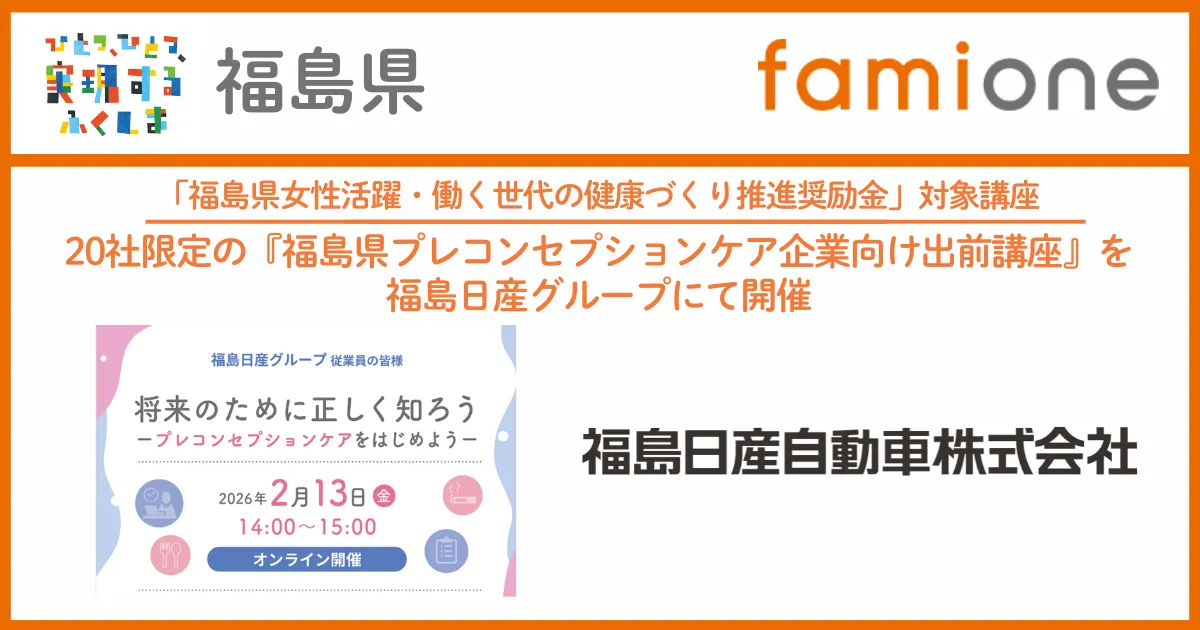 福島日産グループにおいて、2026年2月13日に「プレコンセプションケア」に関する出前講座が開催されました。この講座は、株式会社ファミワンが主催し、従業員の健康促進を目的に設計されています。「子どもを願うすべての人に寄り添い、幸せな人生を歩める社会をつくる」というビジョンのもと、ヘルスケアサポートサービスを提供しています。