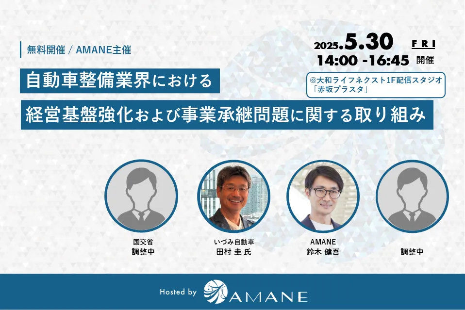 - - 株式会社AMANE 鈴木 健吾: 経営課題に関する調査結果を交え、自動車整備業の現場に直面する実情や、そこから見いだされる対策について解説します。
