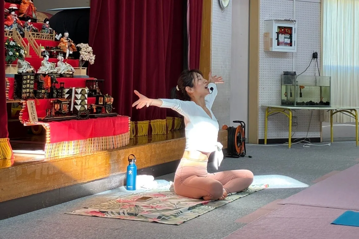徳永葉子インストラクターは、初心者でも取り組みやすいようにストレッチから始まり、呼吸の重要性を強調しながら肩こりや骨盤ケアを中心としたヨガを行いました。彼女は、自身も育児をする母親であり、参加者の気持ちに寄り添った指導が評価されています。ストレッチやヨガへの没入感を高めるような言葉選びで、参加者たちは日頃の疲れを忘れてリフレッシュすることができました。