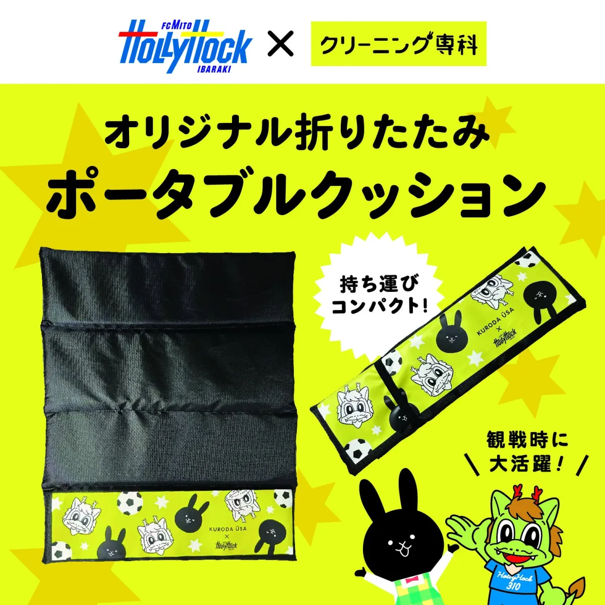 「クリーニング専科サンクスマッチ」では、来場者が参加できるさまざまなイベントが用意されています。その中でも特に注目されているのが、オリジナルクッションのプレゼントです。先着2,000名様に、クリーニング専科のキャラクターである黒田ウーサーとホーリーくんの可愛らしいクッションが配布されます。この機会をお見逃しなく!クッションをゲットするためには、水戸ホーリーホックのファンであることをアピールする必要がありますので、ユニフォームや青いTシャツを着てスタジアムを盛り上げましょう。