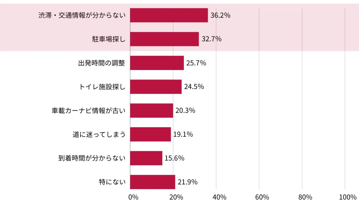 調査の結果、ドライバーたちが最も困っている点として挙げられたのが「渋滞・交通情報が分からない」ということです。次いで「駐車場探し」という声も多く、これらの問題がドライバーのストレスの原因となっていることが浮き彫りとなりました。