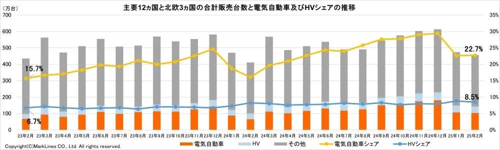 対象国は中国、米国、日本、インド、ドイツ、フランス、ブラジル、英国、韓国、カナダ、イタリア、タイ、ノルウェー、スウェーデン、フィンランドの15カ国です。2025年2月の電気自動車販売台数は103.8万台で、前月比では3.4%の減少が見られたものの、前年同月比では56.9%増という大幅な増加を記録しました。
